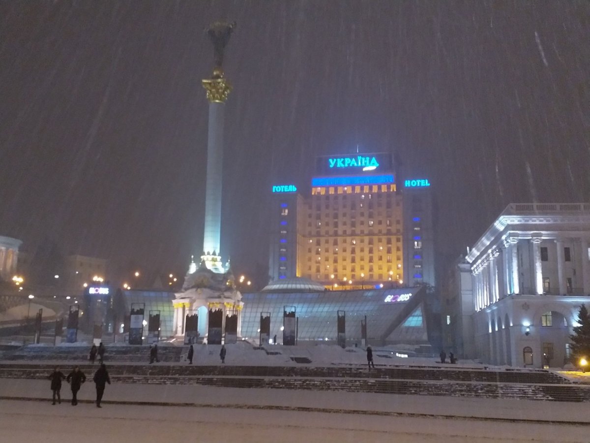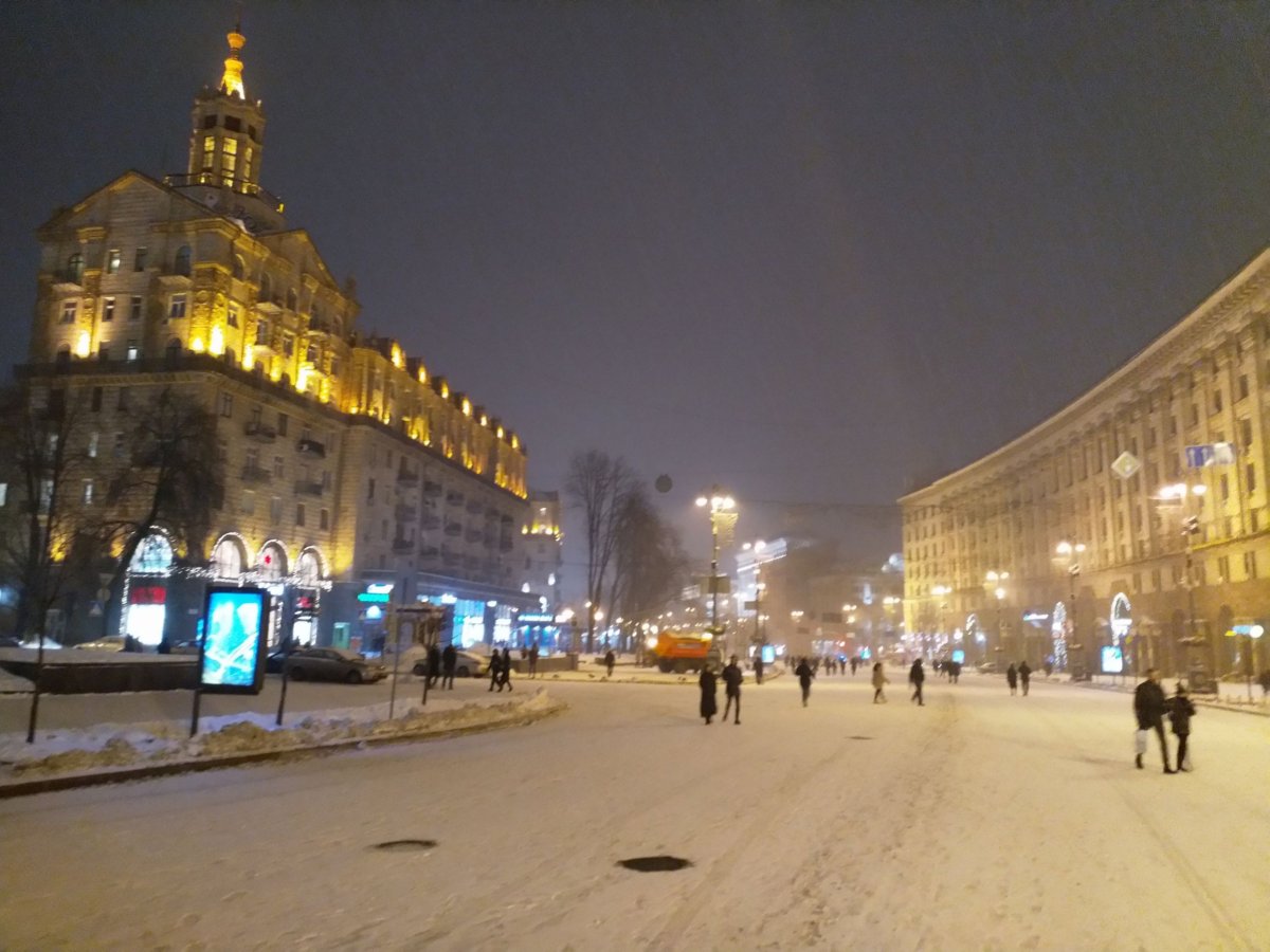 Nakonec seběhneme dolů na Majdan a vynoříme se kousek od apartmánu. Dcerka je unavená, tak zůstane na pokoji. Já zajdu do podzemního nákupního střediska Globus a nakoupím hadry za dobrou cenu v obchodě Defakto. Znovu ověřuji, že mě o tři čtvrtě ráno bude čekat taxi. Recepce 24h denně je klasicky zavřená. Naštěstí přes wifi a aplikaci Booking se domlouváme. Večer začíná hustě sněžit, takže se jdu projít. Bulvár Kreschatuk je uzavřen pro auta. Je to fajn.