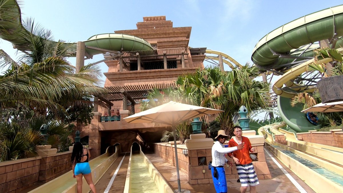 Pátý den jsme plánovali navštívit jeden z nejznámějších aquaparků na světě, je tam ten tobogán, jak projíždíte skrze akvárium se žraloky a rejnoky, tedy Atlantis Aquaventure Waterpark. Aquapark leží na konci známé "palmy" v areálu známého hotelu Atlantis. Jedná se o uměle vytvořený ostrov a poloostrov. Vstup je velmi drahý, ale jelikož já jsem milovníkem aquaparků, tak tenhle jsme prostě vynechat nemohli. Záleží na Vašem zvážení, ale určitě se tady velmi vyblbnete a zároveň navštívíte palmu a hotel Atlantis, což stojí za to. Chce to tady být hned na otvíračku. Je tam super vodní řeka, která Vás na nafukovacím kruhu proveze celým areálem. Určitě se hodně namažte, klidně několikrát denně. K aquaparku se dostanete pomocí metra do Dubai Mariny, poté přesednete na tramvaj, která vás doveze k vláčku na palmě. Z pobřeží přes palmu existuje tzv. Monorail, jedná se o magnetický vláček. Cena je 30 AED za zpáteční jízdenku. Druhou možností je jet taxíkem. Včetně vstupenky do aquaparku je i vstupenka do místního akvária v hotelu Atlantis.