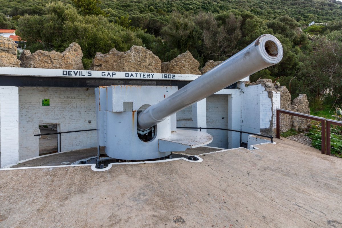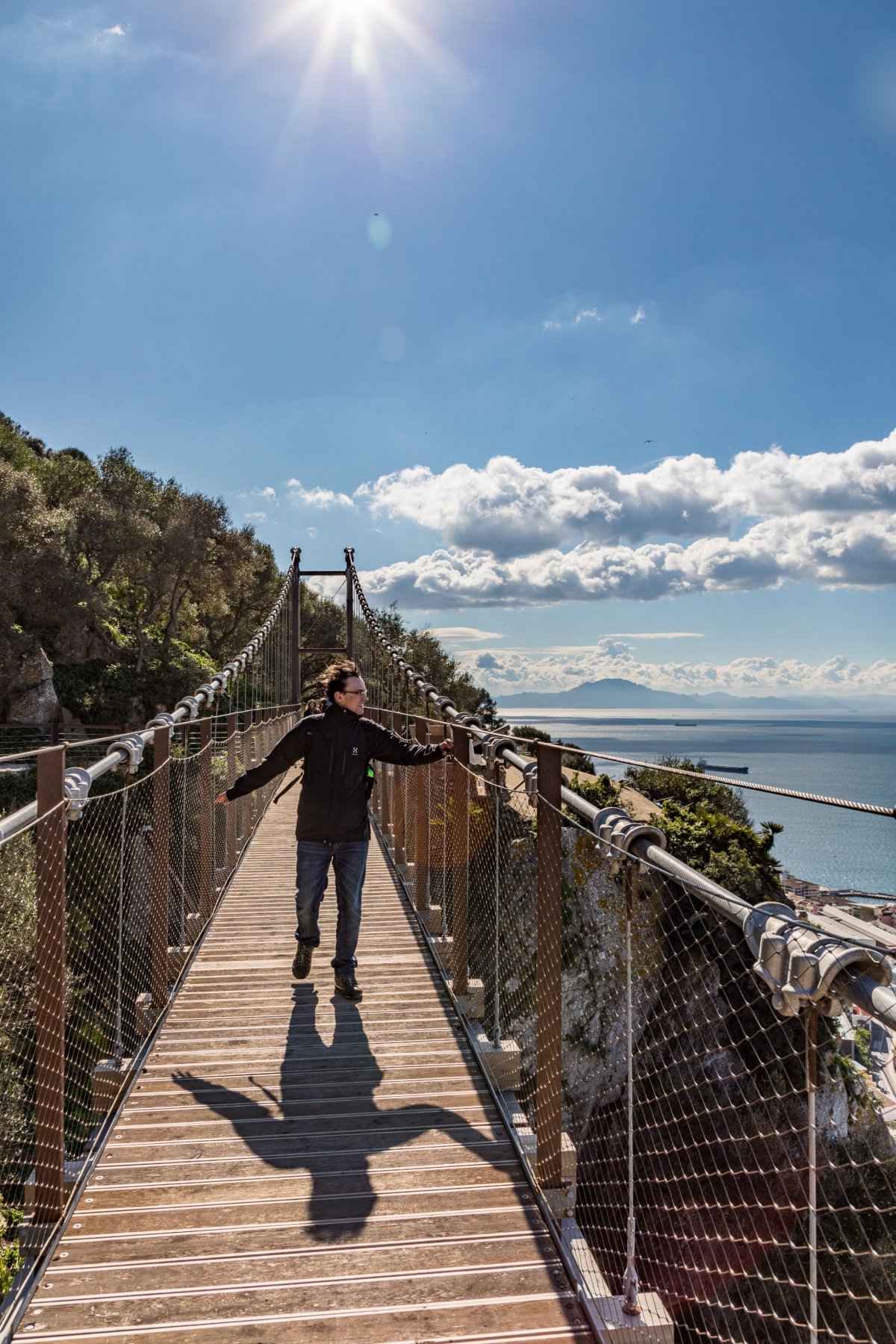 Scházíme z asfaltového chodníku, a vydáváme se sotva znatelnou stezkou v porostu. Zavede nás k jedné z mnoha baterií, tj. dělostřeleckých postavení. Dnes už samozřejmě opuštěných. Je to to, co dělalo Gibraltar Gibraltarem. Strategická pevnost. Skála byla prošpikovaná děly jako nedělní hovězí svíčková slaninou. Děla bezpečně zasáhla cokoliv proplouvající úžinou mezi Afrikou a Evropou. Cesta v porostu není úplně pohodlná, ale už není zima, počasí víc španělské než britské. Jsme zjevně na závětrné straně Skály. Modrá obloha a úžasné výhledy. Přicházíme k visutému mostu Windsor Bridge. Je poměrně mladý a jako všechny visuté mosty se houpe. Snažíme se ho rozkmitat tak, aby spadl. Když se zdá, že by se to mohlo zdařit, prcháme. Opět se dostáváme na asfaltový chodník s pozoruhodnou značkou. Je na ní zkroucený had. Obě dcery přísahají, že to je naposledy co s námi někam jely. Zapínám diktafon a sháním svědky. Číhající opice nad hlavami a hadi pod nohama, to je prostě moc. Následuje další baterie, tentokrát s poetickým názvem Devil’s Gap Batery a skutečným kanonem. Krátký sešup a už jsme na schodech v jedné z uliček mezi prvními domy.
