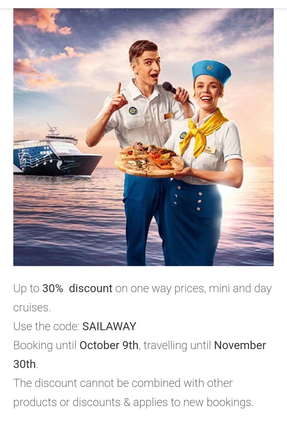 Mě se podařilo udat slevu 50% na jízdenku Tallinn - Helsinki - Tallinn .. tak mám lístek za 9,50€ .. ale bylo potřeba už dříve odebírat newsletter a poslali mi jednorázový kod