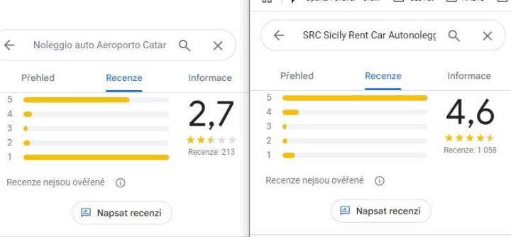 No já rozhodně neberu vždy tu nejlevnější půjčovnu. Nicméně co jsem tím chtěl říct, kouknu na srovnání cen, vidím, že nejlevnější je nějaký velký mezinárodní řetězec, podle google tragické hodnocení. Pak vidím že další v řadě je nějaká lokální no name půjčovna o které jsem nikdy neslyšel. Hodnocení lepší. Vezmu tu první mezinárodní, kde tak nějak vím co čekat a i při nějakém excesu toho místního franšízanta mám stále oporu v globálním supportu. Recenze té mezinárodní neřeším.