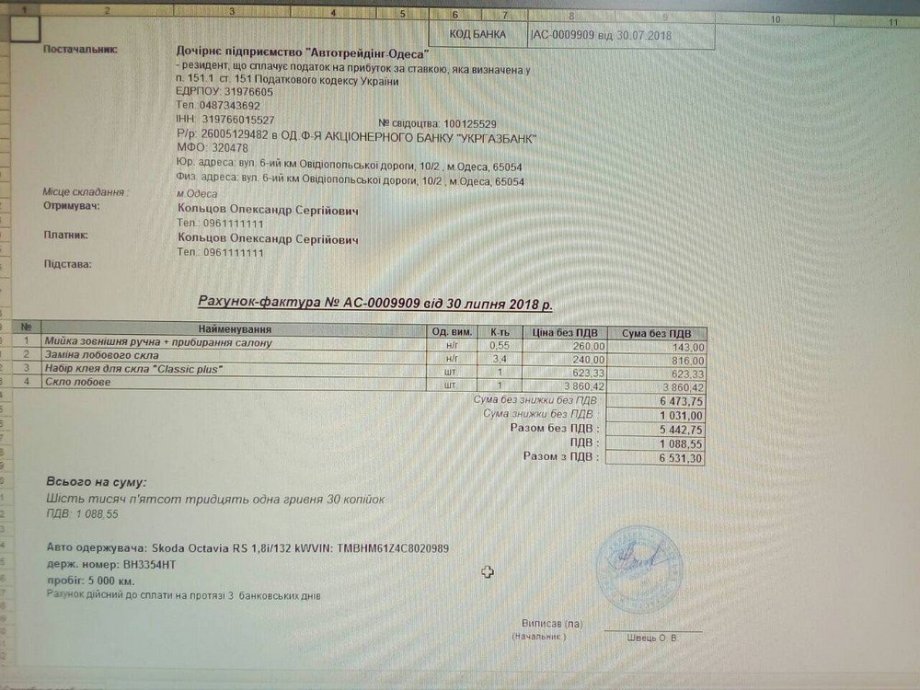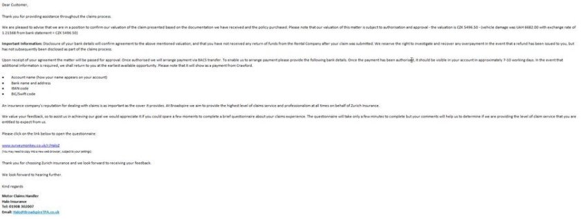 Hned po příjezdu do ČR jsem přes web icarhireinsurance.com zadal žádost o likvidaci a poslal příslušné podklady, kopii výpůjční smlouvy, fotku poškození, kopii dokladu o platbě kartou a doklad o stržení části depozitu ve výši ceny. To bylo 2.8. Následují den jsem dostal e-mail s požadavkem dalších dokladů, resp. s vysvětlením těch zaslaných, protože zřejmě z ukrajinštiny jim to nebylo úplně jasné. Problém byla ta faktura, protože to, co jsem dostal bylo takové trochu šmé, byla to nějaká faktura na sklo na Octávii, byla tam i jiná motorizace, ale naštěstí seděla registrační značka. Navíc to bylo jen ofocené mobilem z monitoru, tedy už na první pohled velící ostražitost.