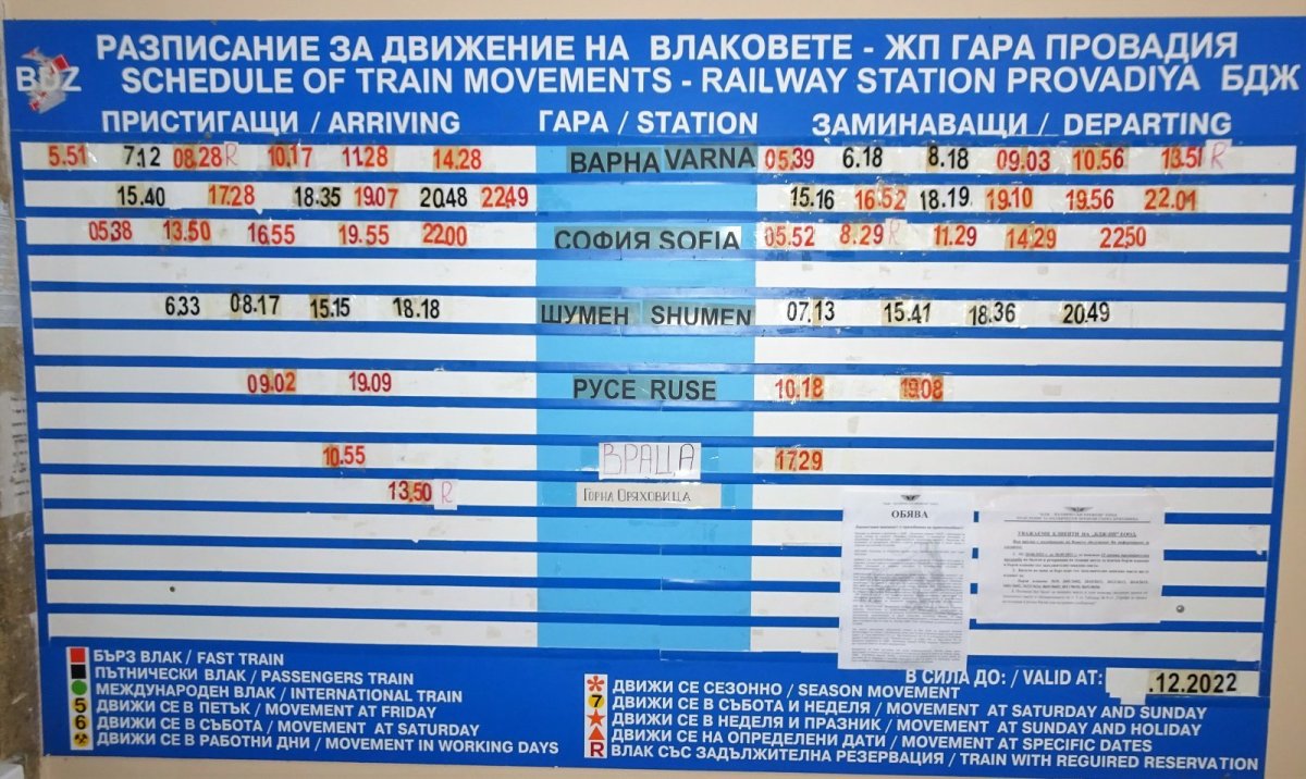 Jel jsem z Varny do Provadie (50km jízda trvala hodinu) - rychlík kterým jsem jel míří až do Sofie a je to nejlepší čím se můžete na této trase svézt .. počmáraný oddílový šrot ze 70-let ,více jak osm hodin do Sofie bych tím jet opravdu nechtěl. Jízdné bylo za hubičku za první třídu včetně povinné rezervace jsem platil 5,70 leva (cca 80 czk).