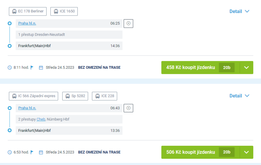 Btw na cestu do Frankfurtu bude lepší volbou Flixbus, pokud teda nemáš nějakou zálibu v přestupech - na cestě z Prahy jich máš minimálně 5 a cesta zabere přes 12 hodin.
