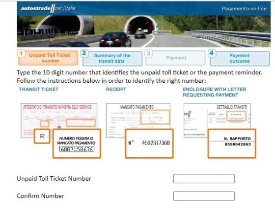 Stalo sa mi niečo podobné cca pred 3 rokmi na diaľnici pod Neapolom, tiež s autom z požičovne. Pri vjazde cez mýtnu bránu som si zobral lístok, ktorý som následne niekde stratil (doteraz netuším, ako sa mi to podarilo, bol som presvedčený, že som si ho dal do vrecka a tam nebol, neviem či mi niekde vypadol... doteraz je to pre mňa záhada). Pri výjazde z diaľnice som povedal obsluhe že som lístok proste stratil, oni mi na počkanie vytlačili ten lístok s pokutou za jazdu bez zaplateného mýta (cca 90 eur, v mojom prípade daň za blbosť), platil som to potom cez net cez túto stránku https://www2.autostrade.it/TPW/h...ution=e2s1