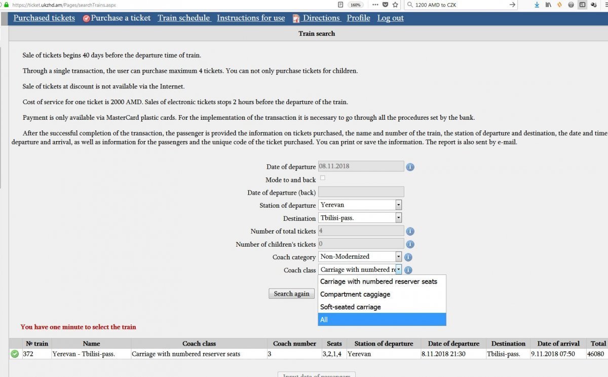 Anglickému popisu se tříd je rozumět hůř než ruskému. Je to arménský vlak, takže koupit jedině u nich. Celníci pohoda, arménští kupodivu lépe vybavení. První třída - Dvě lůžka. Vyspal jsem se líp než v běloruském vlaku, ale tam jsem, pravda, 1. třídu ani nenašel. 😊 Jede to dost pomalu, maršrutka přes den je o dost rychlejší a s lepším výhledem.