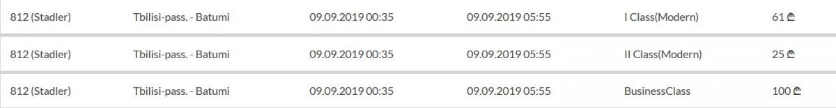 První 2 kategorie jsou spací, ostatní ne. Na obrázku máš Stadlery se sedadly. Mezi Tbilisi a Batumi je spací jen ten mezinárodní vlak 201/202.