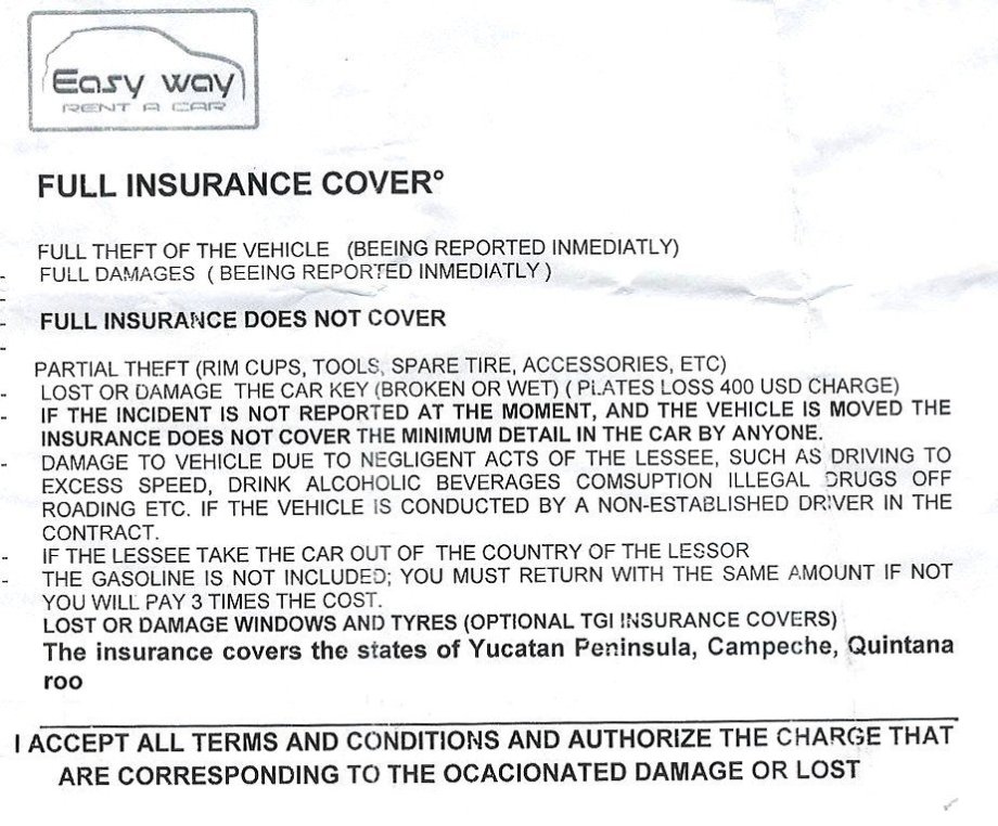 Zase je nějak nedémonizujme, zažil jsem horší, ale i lepší. Přikládám detail z pojištění. Tu platnost jen ve státech na Yucatánském poloostrově mně zdůrazňovali a je napsaná i přímo ve smlouvě.