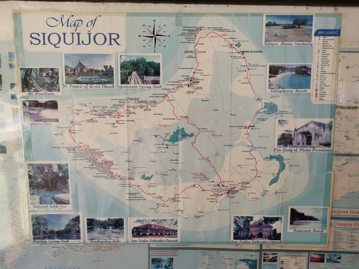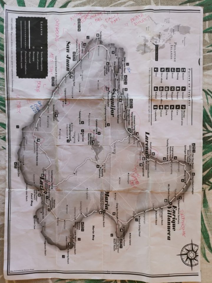Ad Siq - zkusím nahrát mapku, ale vy jste kuci šikovní a s guglem to zmaknete taky. Přistanete lodí v Lareně, cca 38 metrů od výstupu kořeň půčuje fechtle za 350pHP/den, jako deposit necháte třeba šalinkartu. Na fechtlu se dostanete na ostrově všude, je to celkem malé. Ta circular road má cca 100km, relativně nudná, leč skvěle upravená cesta. Určitě doporučuji projet tu cestu přes centrální vrchovinu- při cestě z jihu zabočit v Lazi z circular road na sever - celkem zvlněná a poloprázdná udržovaná cesta. Nějaké vodopády, pár skoků na houpačkách do lagun, nezapomeňte si vytáhnout klíčky od fechtla z kapes před skokem do vody. Dá se vylézt po pár desítkách schodech ze silnice na nejvyšší bod ostrova, výhled OK, nic dechberoucího, pivo tam neseženeš. Výlet na Apo Island jsme neabsolvovali a mrzí mě to. Nejlepší domorodou vývařovnu s velice dobrou škálou produktů místního lihovarnického průmyslu jsme našli na severu v Ayans Local Food - kraťučká odbočka z Circular Road (možná se tak nejmenuje, ale asi z mapy chápete o čem mluvím-kruhová přípobřežní cesta). Problémem je pak cesta domů pokud bydlíte na opačné straně ostrova a je noc a nesvítí vám světlo. Zachraňoval jsem německého turistu Helmuta z Dusseldorfu, který se fest vysekal cca 10 metrů od hospody na cestě dom a měl asi dost pěkný otřes mozku, bez blembáka na hlavě by mu asi hlava pukla vejpůl.