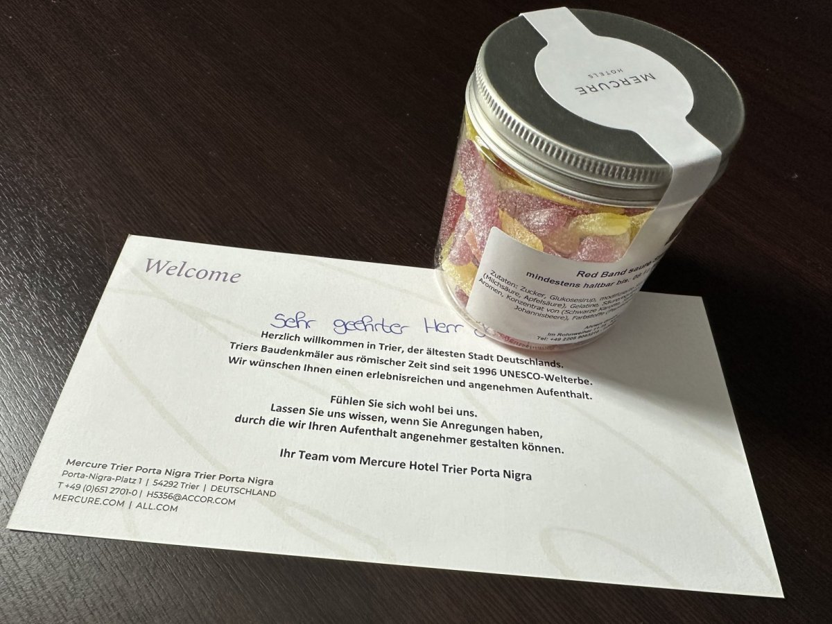 Welcome drink: Na recepci proaktivně předán voucher na welcome drink, který jsem si proměnil za skleničku bílého vína (na výběr bylo ze všech vín, které nabízeli po skleničce – asi 5-6 druhů). Tady rozhodně palec nahoru za to, že blízkost vinařské oblasti (Mosel) promítají i do nabídky nápojů.