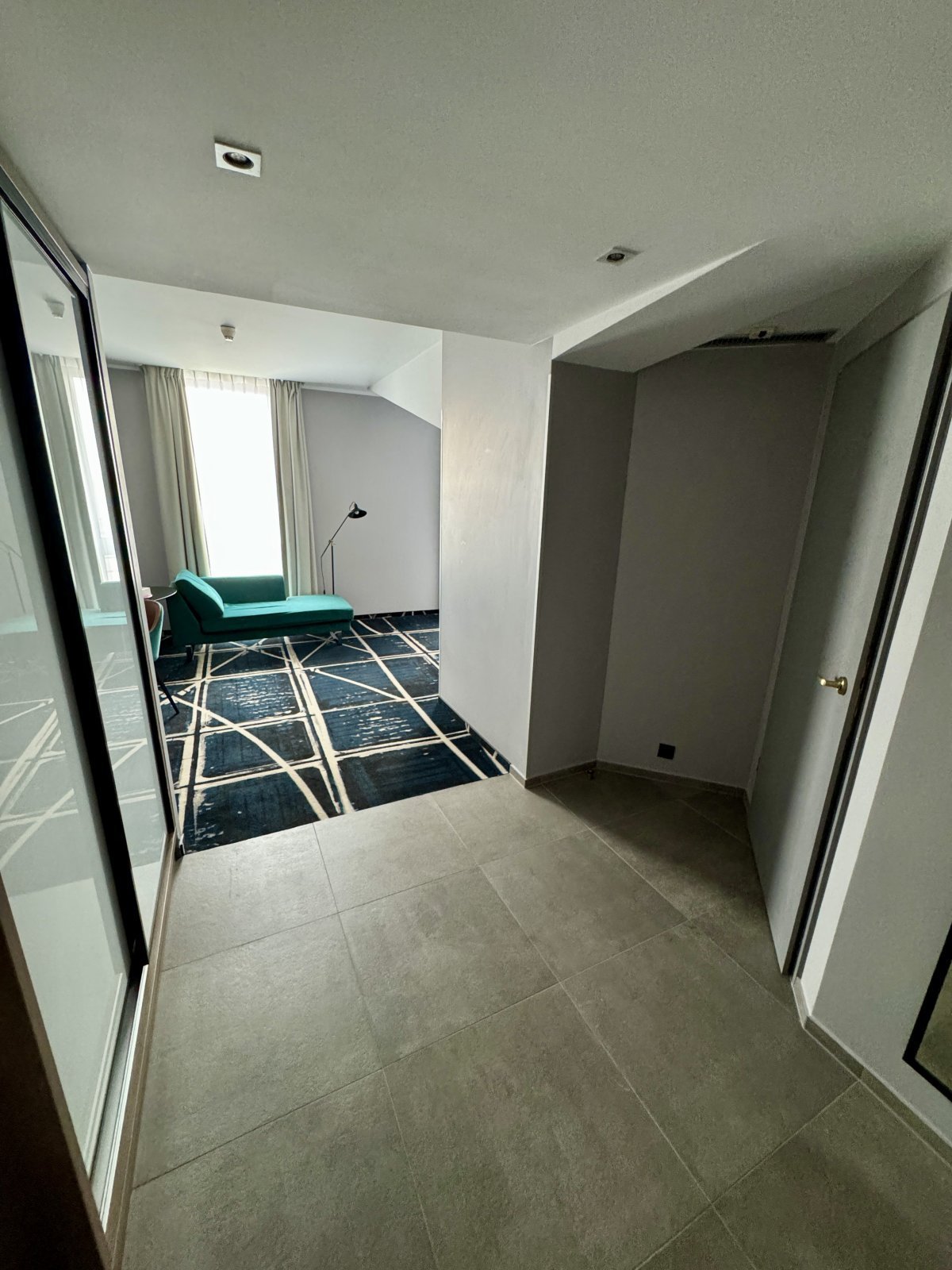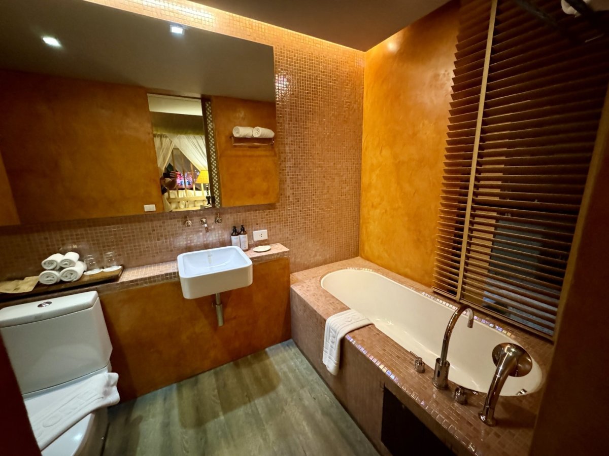 Nachází se v třípatrové budově u pláže a bazénu. Pokoje máme v přízemí vedle sebe. Dovnitř se vchází přes terasu, následuje podlouhlá místnost v pořadí odpočinkové zóny s televizí, obrovským gaučem a minibarem, ložnice s King size postelí, šatna, koupelna s dvěma místnostmi.