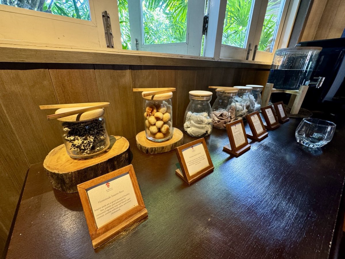 Během check-inu nám je nabídnut welcome drink v podobě jasmínového čaje ještě s nějakou přísadou. Jasmínový čaj se tu používá jako přísada i do vůní či masážních olejů. Společně s nápojem milá slečna provede rituál, kdy vám z nitě vyrobeného náramku přejíždí po předloktí a přeje každému spokojený pobyt a následně náramek uváže na ruku.