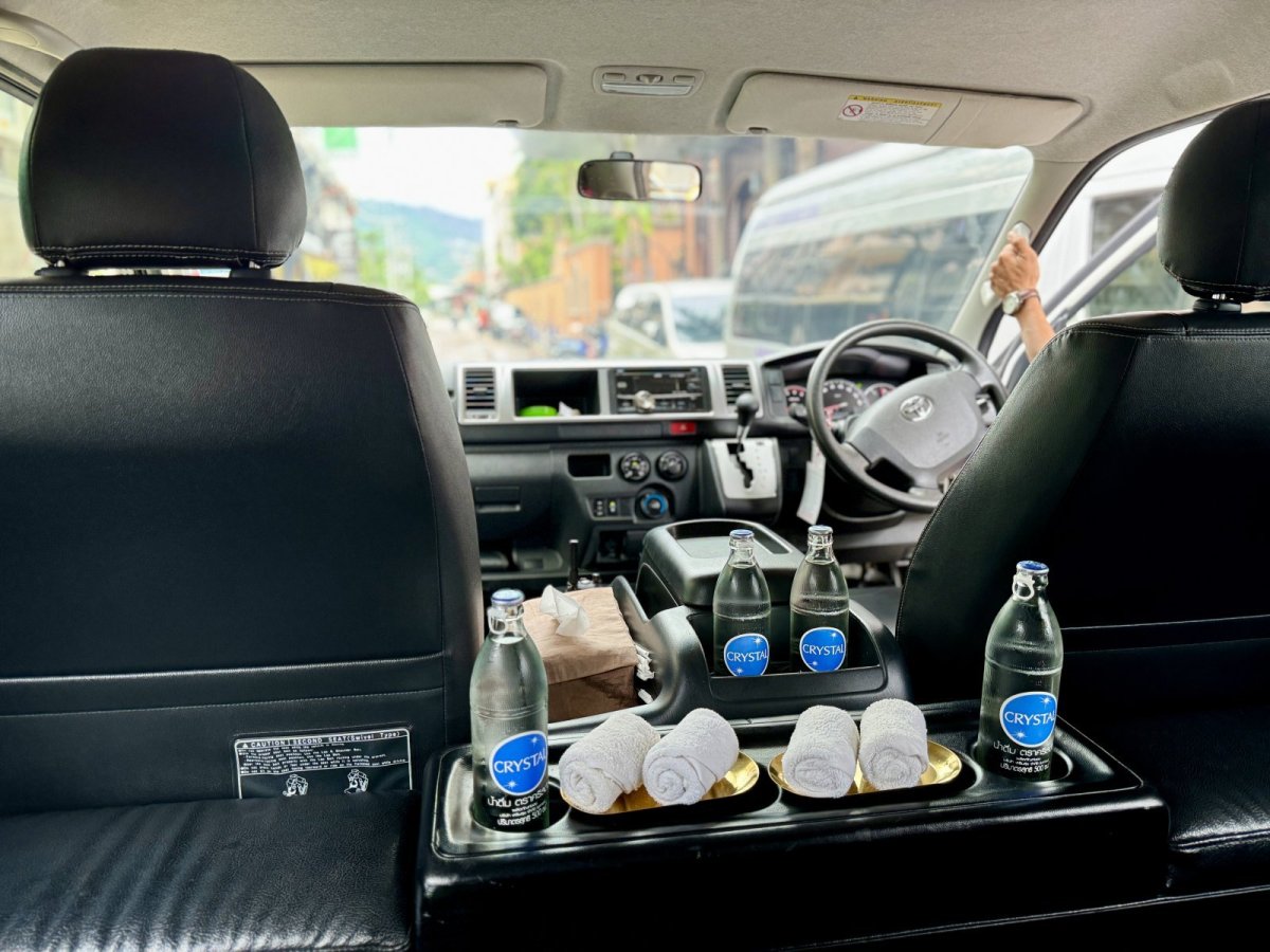 Minibus dorazil přesně včas a uvnitř čekaly mokré ručníky a voda.