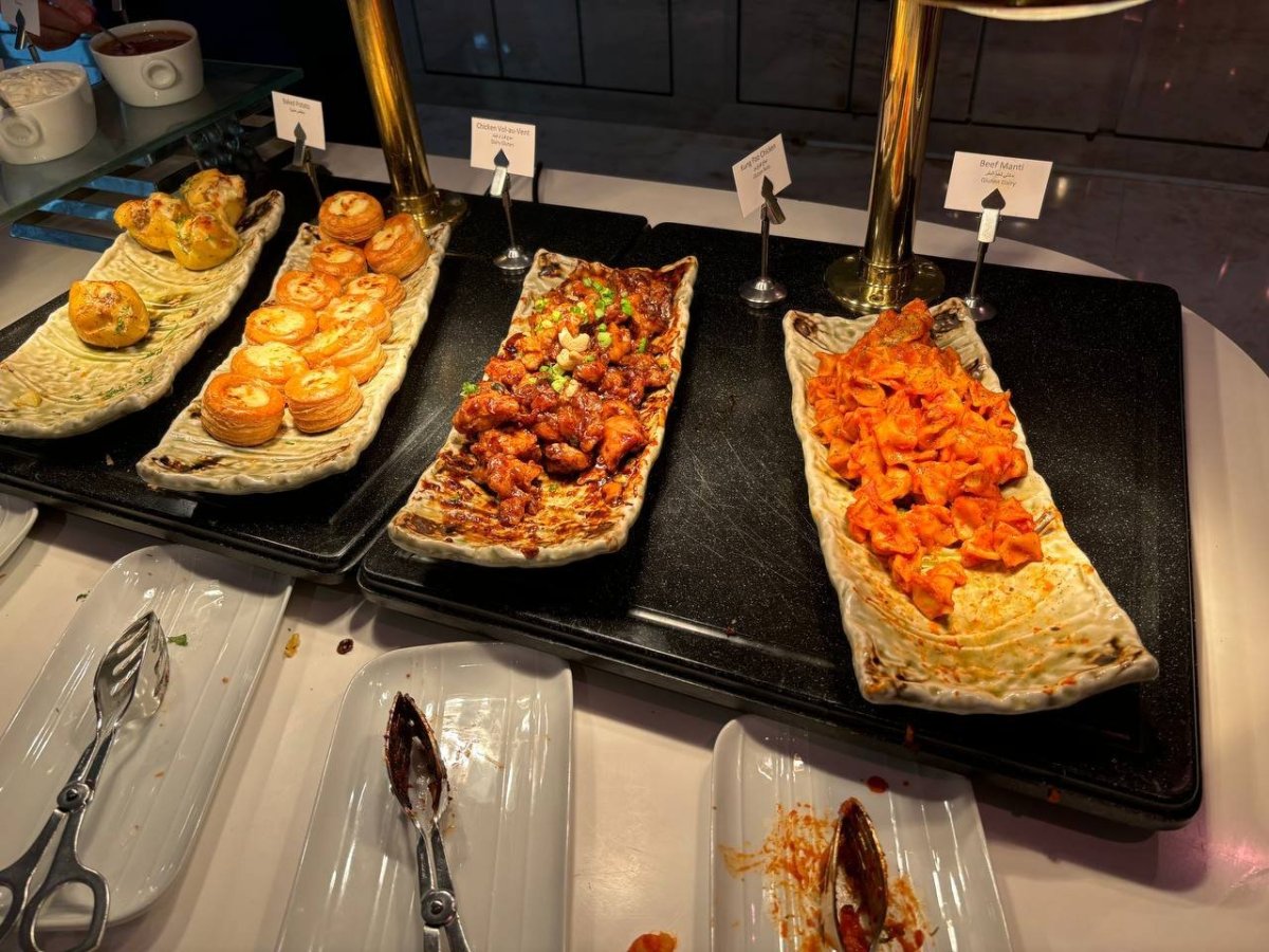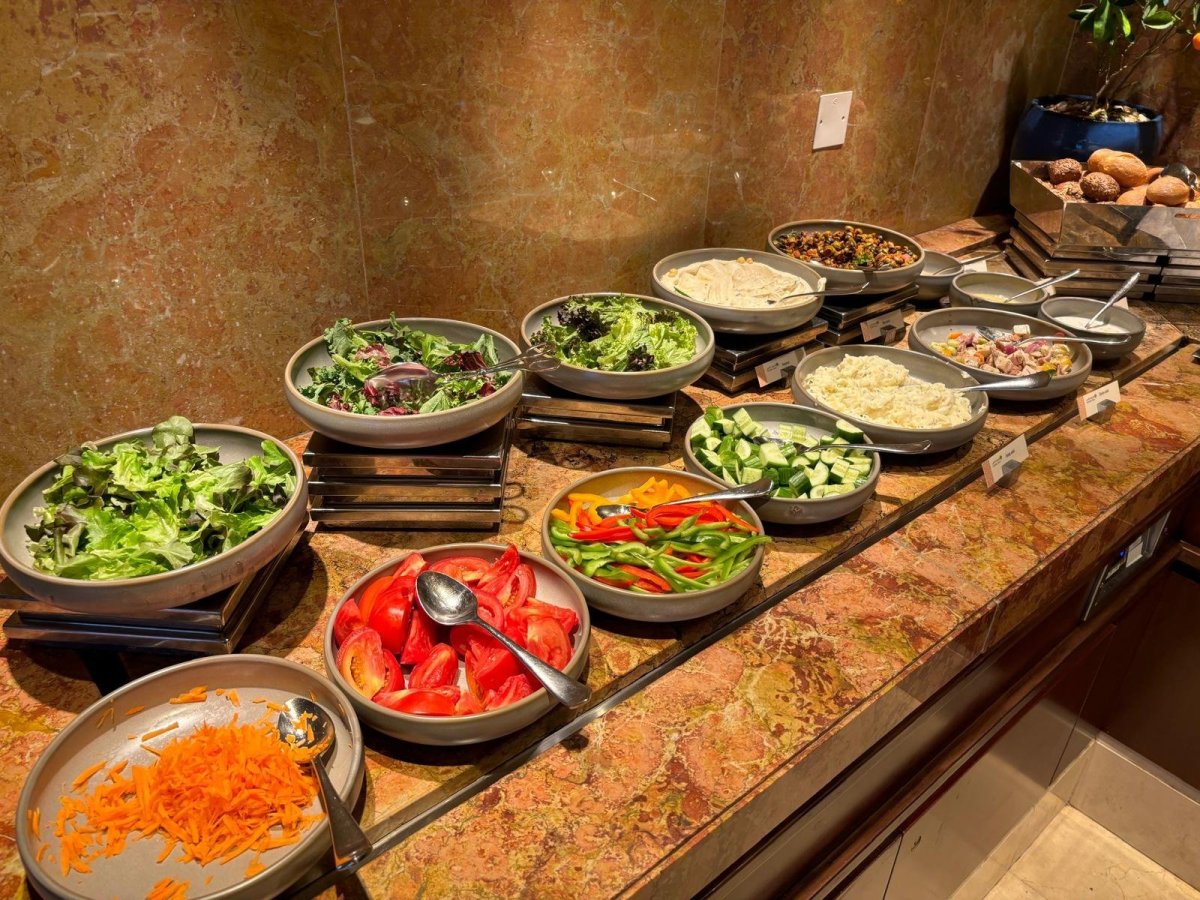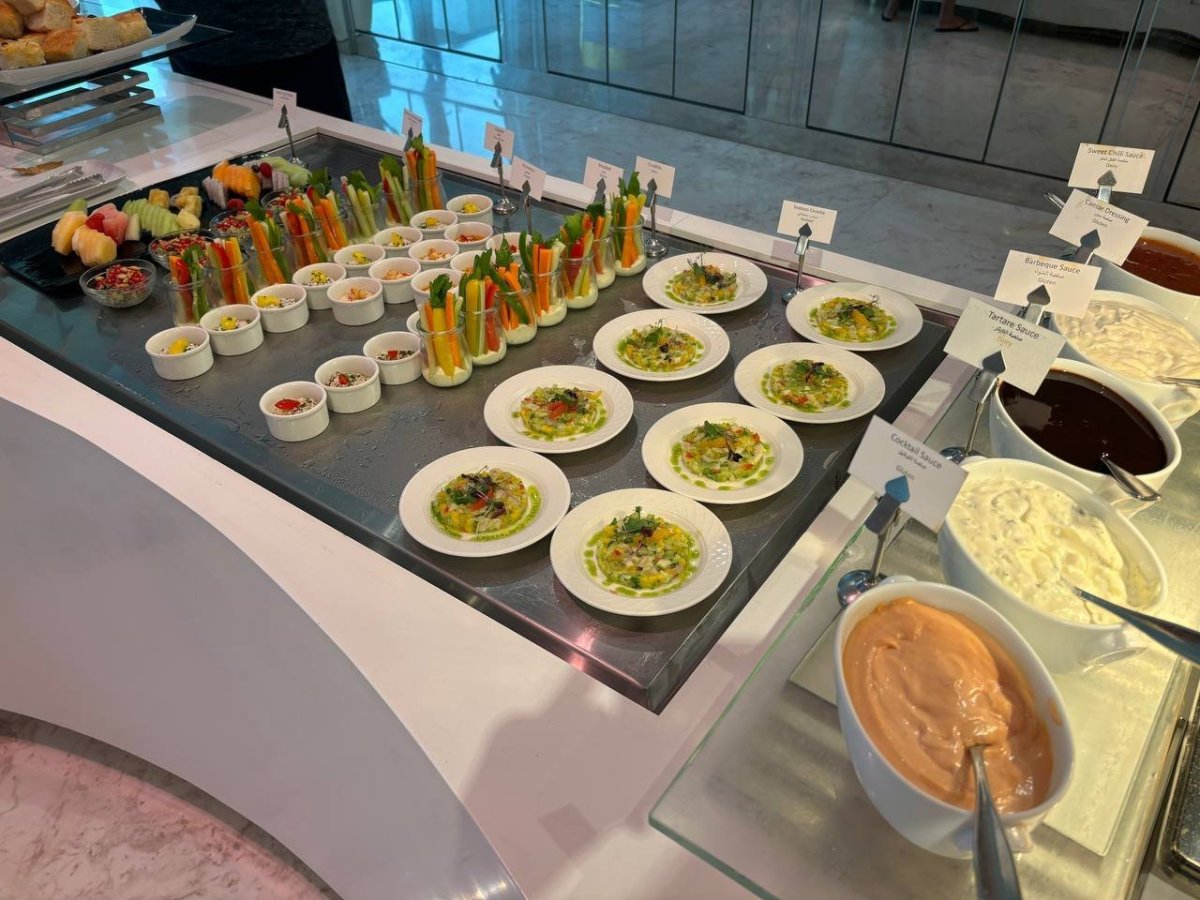 Salónik : Nájdete ho na 9. poschodí a je rozdelený na päť miestností, čiže aj pri väčšej obsadenosti si viete nájsť súkromie. Ponuka jedál bola dostatočná, na večeru boli vždy tri teplé jedlá. Nebolo to zlé, ale ak to mám porovnať s predchádzajúcim hotelom Sofitel JBR, tak som od Fairmontu čakal viac, keďže táto značka je o triedu vyššie nad Sofitelom, plus toto je regulérne spoplatnený salónik, kam sa nedostanete zadarmo na členstvo. To isté platí pre ponuku a hlavne prezentáciu dezertov a šalátov, tu žiaľ na celej čiare vyhráva Sofitel JBR.
