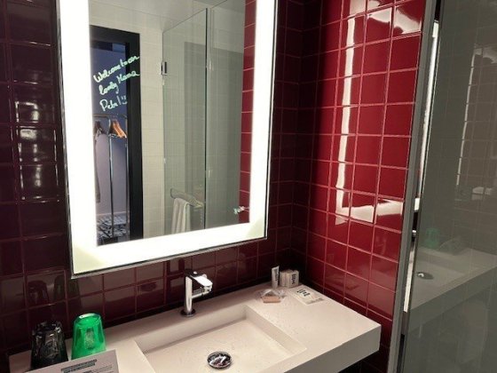 Zklamala mě úroveň ubytování. Zařizovací předměty v koupelně působí velmi levně jako někde v Ibisu. Design pokoje je zajímavý, ale nemůžu se zbavit dojmu, že je motivovaný především úsporami, než funkčností. Nemáte žádnou pořádnou skříň a na pokoji není ani konvice na čaj.