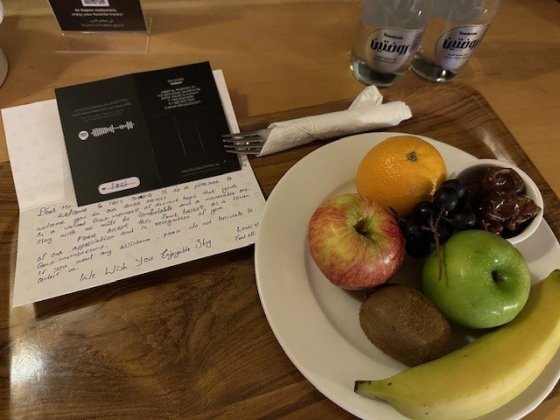 Dárek: Talíř s ovocem. Skvělé byly především datle. Ručně psaný uvítací dopis je rovněž k vidění někde od Fairmontu výše.