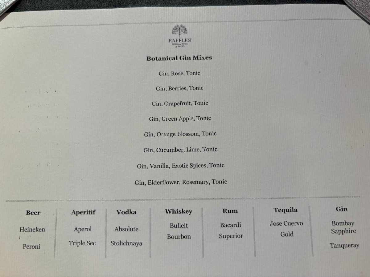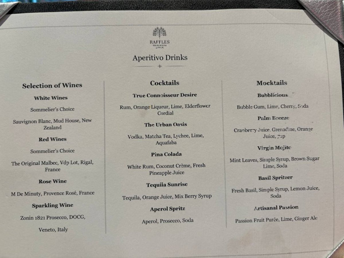 Ponuku jedál dosť osekali a zo všetkých štyroch hotelov, ktoré sme navštívili tu bolo jedlo najmenej chutné, hlavne vajcia na raňajky. Ponuka, prezentácia a atmosféra vyzerali skôr ako klasický letiskový salónik, a nie ako Raffles, ktorý o sebe tvrdí, že hrá rovnakú ligu so značkami Ritz-Carlton alebo Four Seasons. Nápoje takisto silný priemer, za nás to zachránilo jedine provensálske ružové Minuty, ktoré patrí medzi naše obľúbené vína. Z ponuky tvrdých akousi zázračnou náhodou vyčnieval 45 % bourbon Bulleit, ktorý bol pre mňa novinkou a chutil fakt dobre. Ináč to bola slabota, na nejaké prémiovky alebo koňak ani nepomyslite. Koktejly takisto jedna veľká bieda, barman bol nielen nešikovný, ale ešte aj šetril na alkohole. No zato sme sa aspoň mohli cítiť ako doma na Slovensku :)
