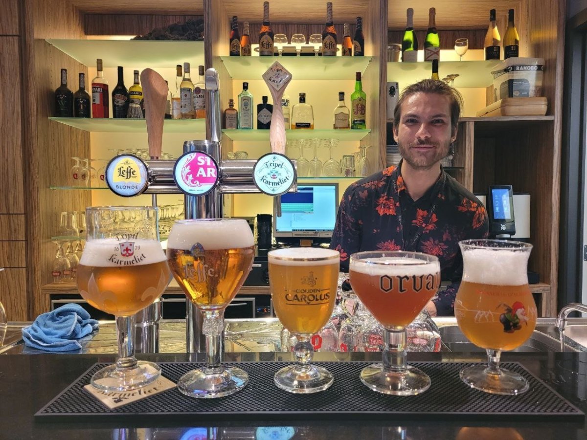 Welcome drink : Sme v Belgicku, preto muselo vyhrať pivo. Dostali sme poukážky pre všetky tri izby, čiže 5 osôb (čo podľa pravidiel nemuseli). Na recepcii/bare mal akurát službu chalan z Bratislavy, ktorý v Leuvene študuje, môžete ho vidieť dole na fotke, na ktorú mi dal povolenie. Pivá boli vynikajúce, k tomu skvelý pokec s barmanom.