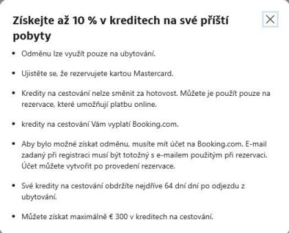 Pro získání této odměny je nutné vytvořit jednu rezervaci v hodnotě minimálně € 50 Maximální výše odměny je € 100 Tento kód lze uplatnit jen jednou Kód je třeba uplatnit před dokončením rezervace a nelze ho uplatnit na existující rezervace zpětně Odměna bude vyplacena do Booking.com Peněženky v podobě kreditů na cestování Kredity na cestování obdržíte do své Peněženky přibližně dva týdny po odjezdu z ubytování Platnost kreditů na cestování bude 1 rok ode dne, kdy je obdržíte do své Peněženky