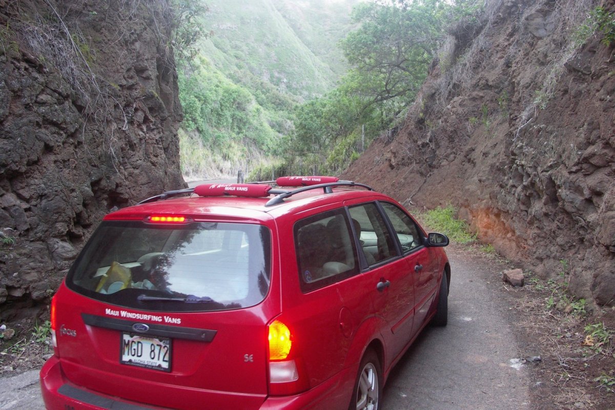Silnička 30 na severozápadním cípu Maui je opravdu úzká viz foto asi nejextrémnějšího úseku, ale aspoň tam byl téměř nulový provoz (na rozdíl od Road to Hana). Já bych tuto oblast silnice 340 a 30 západně od Kahului za nejhezčí část Maui nepovažoval, i když jsem tam šel i na několikakilometrový výlet po hřebínku. Půjčovny tento úsek (a taky na JV ostrova, kde je po konci Road to Hana asi stále jen nezpevněná silnice) mají asi ve výlukách. Ta má strašila poplatkem 500 USD, pokud bude na těchto úsecích třeba odtah, který byl jinak zahrnutý v ceně půjčovného.