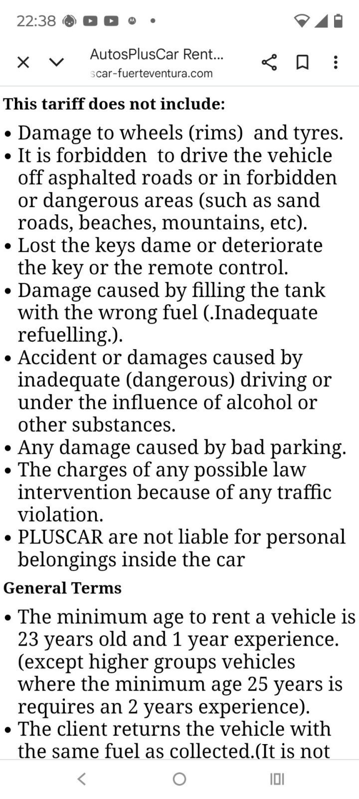 Nepsal jsem, že si tam každý prorazí pneumatiku. I kdyby to byl jen 1 z 1000, je to reálná možnost. Pravděpodobnost defektu není nulová ostatně ani na asfaltu. Problém je v tom (jak tu už delší dobu diskutujeme a napsal to i Miňo), že půjčovny jízdu po nevyasfaltovaných silnicích zakazují. A když tam někdo jede, neplatí tam pojistka (je to podobné, jako když např. způsobíš nehodu pod vlivem alkoholu). Když se cokoli stane, jsi zodpovědný za celou škodu. Může se jednat i o poruchu auta nezpůsobenou stavem cesty, kdy těžko prokážeš, že by porucha nastala stejně. Minimálně odtahovku budeš platit ty. Přikládám část podmínek Pluscar a Autoreisen. U Cicar jsem to nenašel na jejich webu, ale v diskuzích jsem četl vícekrát, že to taky zakazují. Těžko existuje půjčovna, která nechává platnost pojistky na takových silnicích pro běžná auta, a to nejen na Kanárech, ale ve většině vyspělých zemích.