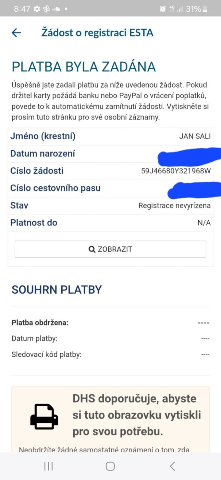 Je to záhada hlavolamů. Stáhnul jsem si jejich aplikaci ESTA.  Kontroluji tu žádost přes aplikace každý den minimálně 5 x za den .. Pořád tam je napsáno žádost se kontroluje . V žádosti jsou všechny mé údaje..   v úterý ráno 12.8 proběhlo přes mojí kartu platba 21.dolaru.  včera ještě byla platba rezervována .  Zkopíroval jsem si tuhle položku o platbě a poslal na email.  Dnes ráno jsem se znovu díval na účet a ta rezervovaná platba zmizela úplně, jako když se vypaří.  Volal jsem do banky poslal email s tou transakcí 21.dolarů . Teď zjišťuji co se vůbec stalo a kam ta platba zmizela..