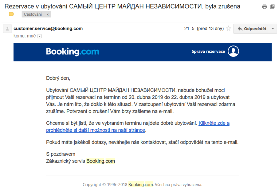 Tak asi neprodává dál pobyty přes booking. Je to normální mail, nevím jak se pozná nenápadný informační od běžnýho nebo jak by sis jej představoval, jestli by tam mělo být 5 červených vykřičníků. Standardně Ti dali vědět navíc skoro rok dopředu, máš snad dost času si najít jiný ubytko, věřím, že se to dá zvládnout. Chápal bych, kdyby Ti to zrušili den dva dopředu, pak bych očekával, že se o mě postarají a byly by pochopitelný požadavky na sehnání alternativy, případně nějak řešit tu cenu, ale buď soudný.
