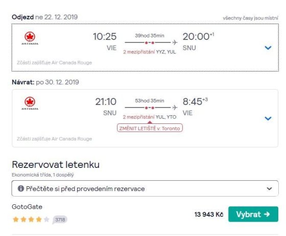 Kuba přes Kanadu mi připadla trochu divoká a kdyby mi ještě zbývala energie, tak do toho jdu i kvůli celodenním stopoverům v kanadských velkoměstech, kde jsem ještě nebyl. :) Našel jsem relativně levné letenky (kolem 15 000 Kč) z Vídně jen do Santa Clary, jinam byly o dost dražší. Hloupé je, že za těch pár dnů trošku zdražily a už se tady nedají najít (našel jsem je přes Skyscanner a tady je musel rozepsat, jinak mi to našlo jiné, dražší).