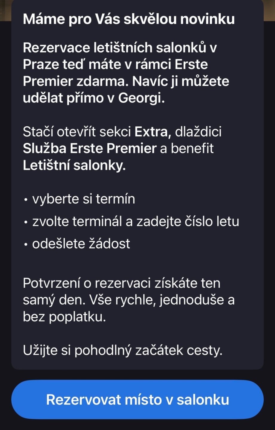 Rezervaci vstupu do letištních salonků Erste Premier Lounge a Mastercard Lounge v Praze máte nově zdarma.