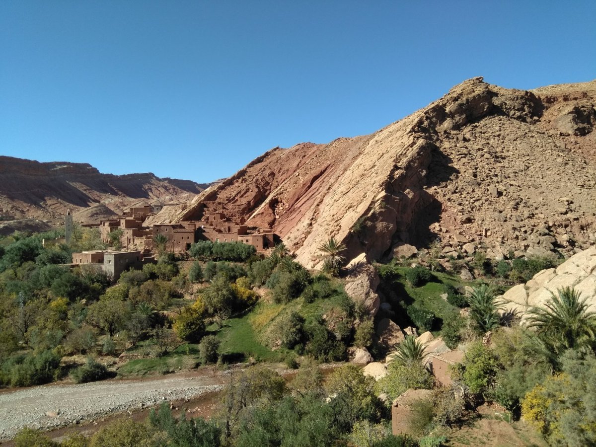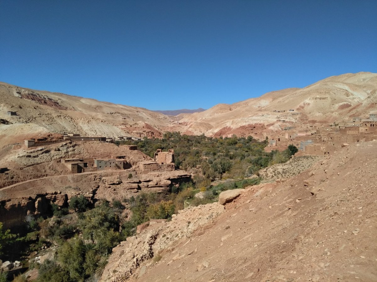 Dám sem aktuální fotku výhledu od stolu restaurace Auberge Achahoud severně od Ait ben Haddou. Je to krásné údolí bez turistů s úzkou asfaltkou viz další fotky.