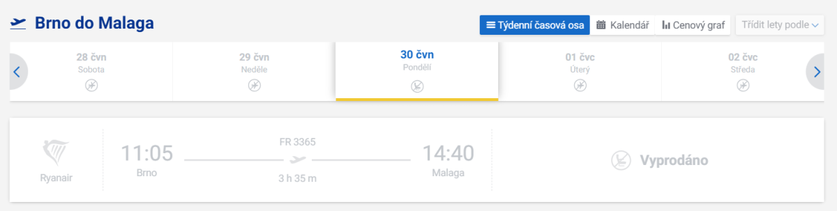 Brno-Malaga 31.3.2025-23.10.2025 pondělí AGP(7:15)-BRQ(10:40) BRQ(11:05)-AGP(14:40) čtvrtek AGP(10:20)-BRQ(13:45) BRQ(14:10)-AGP(17:45)
