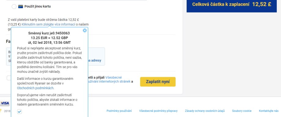 Čaute, mám dotaz ke směnnýmu kurzu, který Ryanair používá. Kupoval jsem teď letenky z Bratislavy do Niše a Ryanair očividně použil svůj kurz (27,38 Kč/EUR) takže se nám to trochu prodražilo. Nejde mi ani tak o tu asi stovku navíc co jsme zaplatili, ale trochu jsem se pídil a v Terms & Conditions v článku 4.3 stojí: