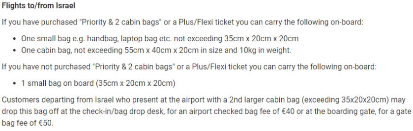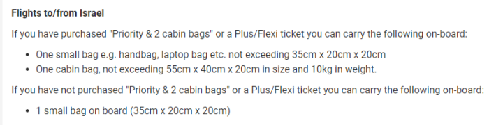 Effective from 15th January 2018, due to additional security checks on flights to and from Israel, Non-Priority customers are only permitted to carry 1 small bag (35x20x20cm) on board.