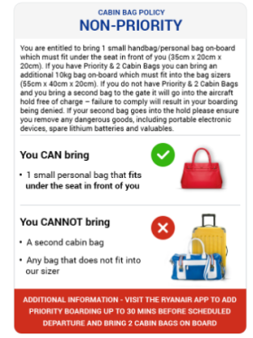 Aside from Priority customers, larger cabin bags will not be accepted on board, and will be subject to a €50 gate bag fee at the gate.