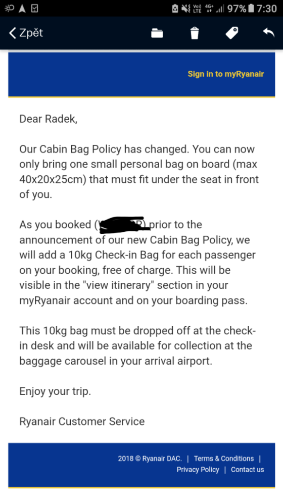 Ryanair zavazadla zase jinak. Uznal, ze retroaktivni zmeny jsou za caru