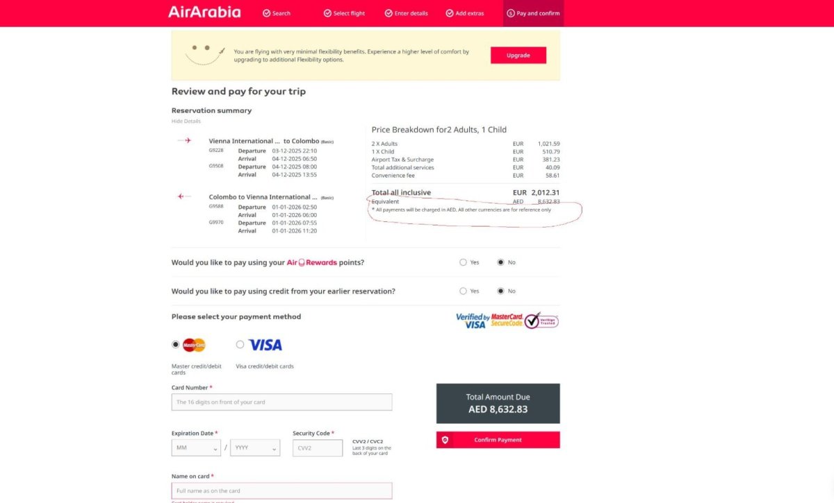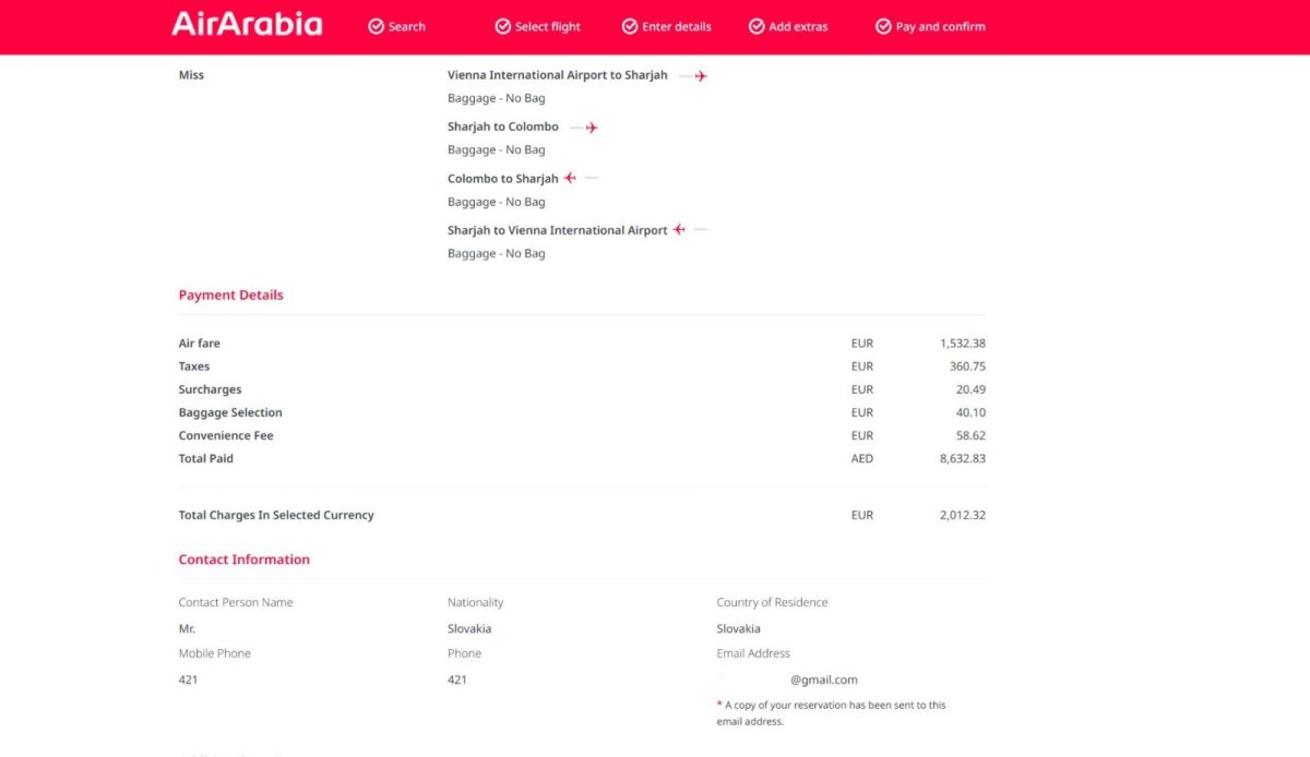 Ahoj Lordi, asi uz neskoro, ale ... potrebujem tomu rozumiet - prave som robil letenky priamo na airarabia.com. Priamo na stranke Airarabia, ... Total Paid 8633AED, Total Charges in Selected Currency 2012EUR.