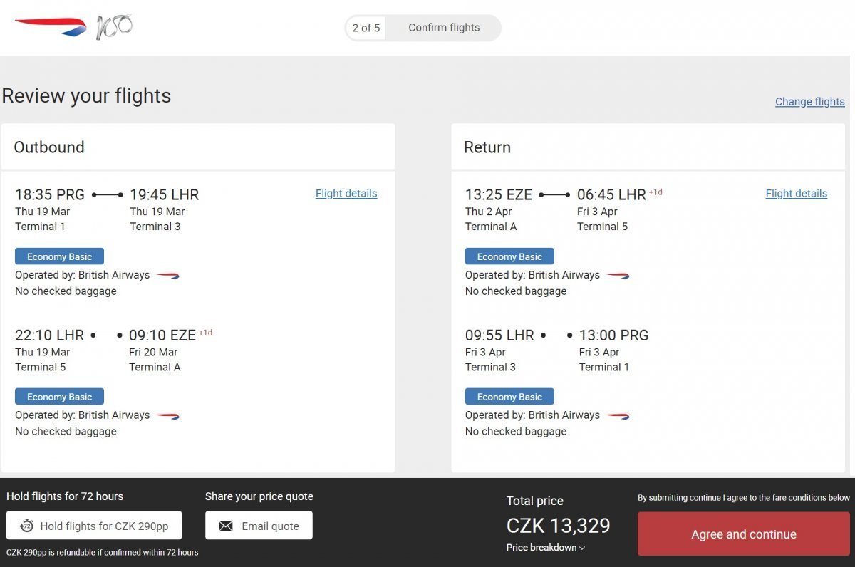 Základ jsou letenky z Prahy do Buenos Aires, ty momentálně nabízí British Airways za 13.329 Kč