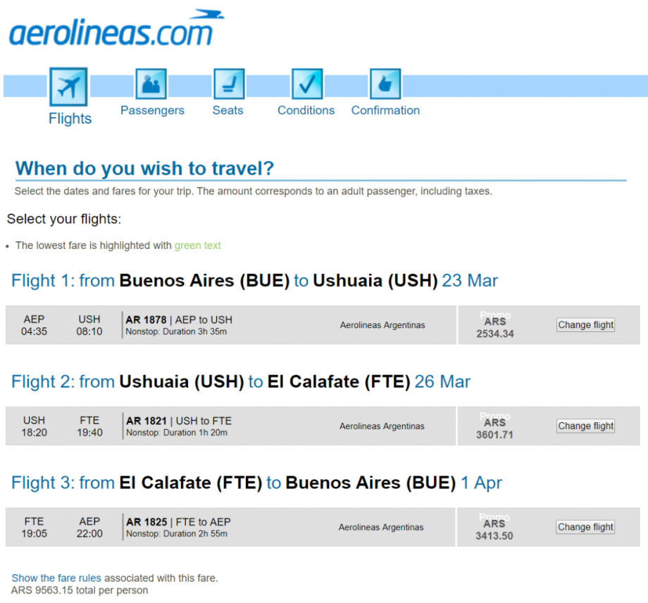 Přelety jsou v trojúhelníku Buenos Aires - Ushuaia - El Calafate - Buenos Aires, v akčním tarifu, kupováno na jedné letence u Aerolíneas Argentinas za 9563 ARS / 4010 Kč