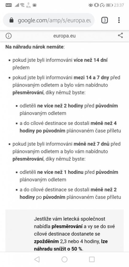 Kryštof Hájek napsal(a):no, podle tohoto z EU webu by měli mít nárok.Nárok na kompenzaci dle EU261 je při zpoždění větším než 3 hodiny. Což není tenhle případ, jak popisuje Tomáš.
