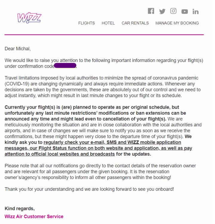 Ahoj všem cestovatelům, chtěla jsem se zeptat, zda někdo ví, jak je to s letenkami zakoupenými teď u společnosti Wizzair. Pokud si koupím letenku na červen a situace se nezlepší - tedy buď moje země, nebo cílová destinace budou stále uzavřeny a nebude možné letět, vrátí mi wizzair peníze, popřípadě vystaví mi voucher na budoucí lety? Nebo se už teď chrání nějakou klausulí , že nepojistí žádné budoucí lety, které se kvůli Koroně nebudou moci uskutečnit? Děkuji moc, .