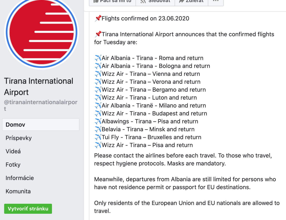 Commercial flights returned to Albania on June 15, 2020, with flights from Tirana to Vienna, Belgrade, and Athens. The Government of Albania has declared that only European Union residents and nationals are eligible to board these flights at this time.