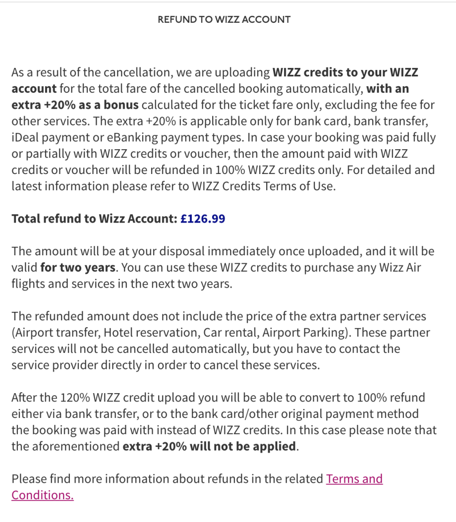 In case your booking was paid fully or partially with WIZZ credits or voucher, then the amount paid with WIZZ credits or voucher will be refunded in 100% WIZZ credits only. For detailed and latest information please refer to WIZZ Credits Terms of Use.