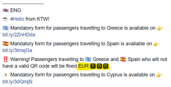 Katovické letiště mi naservírovalo pěknou novinku - pokud nebude mít validní QR kód pro cestu do Španělska nebo Řecka, dostanete pokutu 500 euro.