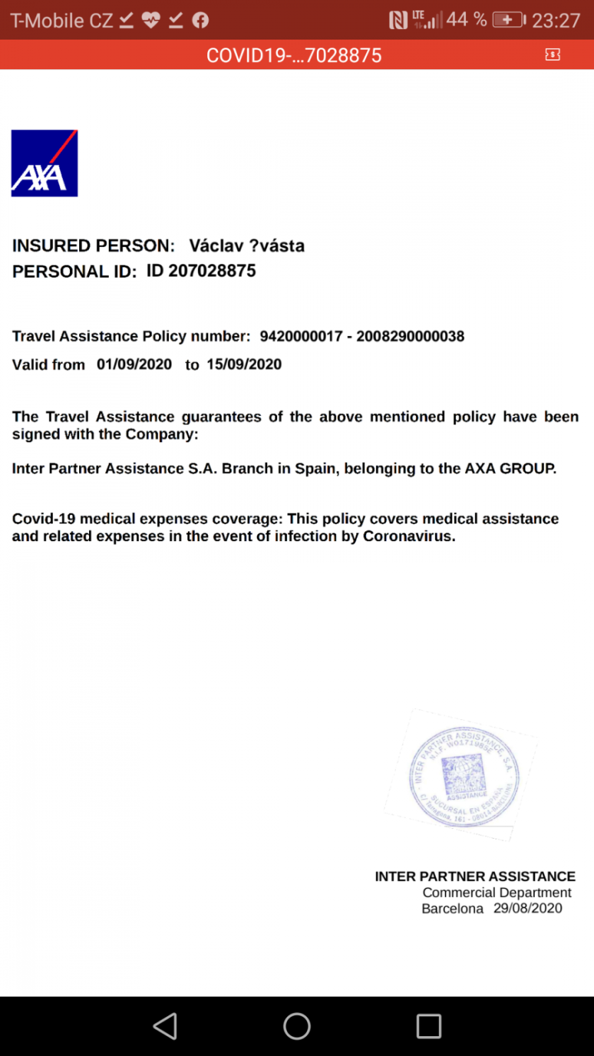 Tak jsem nakonec poridil pojištění pres heymondo.es, pojištění zajistuje AXA a soucasti je certifikat od AXY, ze budou kryt veskere udalosti spojene s koronavirem. Takze jeste jednou diky Mandarinka 👍