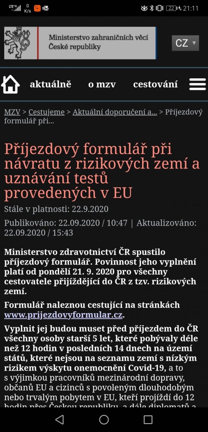 Od 21.09. QR kód povinný formulář vyplněný před příletem.