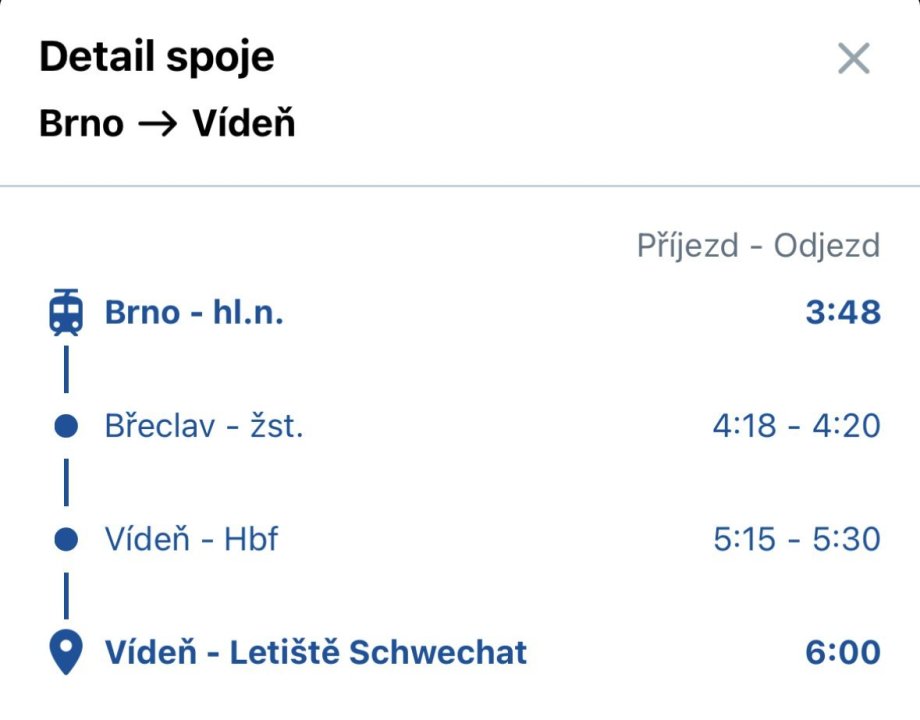 Ahoj, není ten příjezd 5:15 do Vídně? Myslím, že první vlak co jede z Brna má příjezd na letiště 6:00