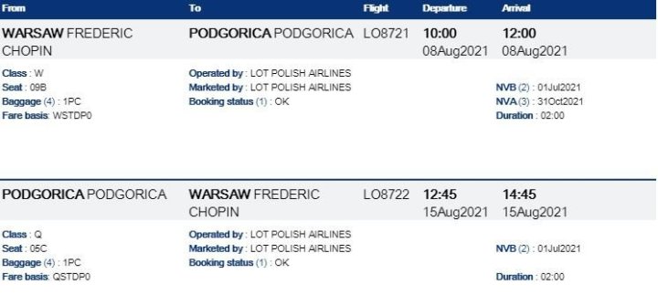 Ahoj, nabízím k prodeji dvě zpáteční letenky do Černé Hory - Podgorica v termínu 8.8.-15.8.2021 s odletem z Varšavy se společností LOT. V ceně je i odbavené zavazadlo 23 kg. Cena dohodou. .