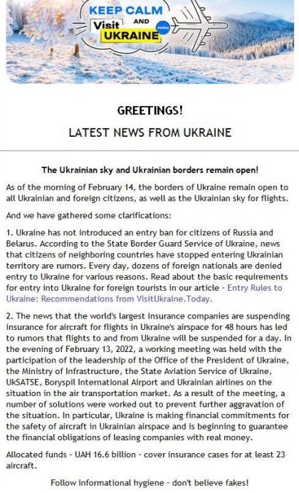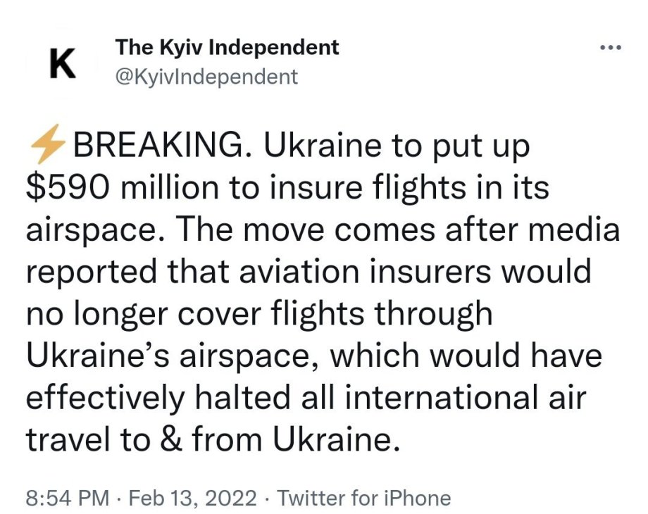 Due to the foreign policy situation, Ukraine International Airlines has received an official notification from insurance companies about the termination of aircraft insurance for flights in the airspace of Ukraine. provided that other aircraft remain in the company's fleet, "the statement said.