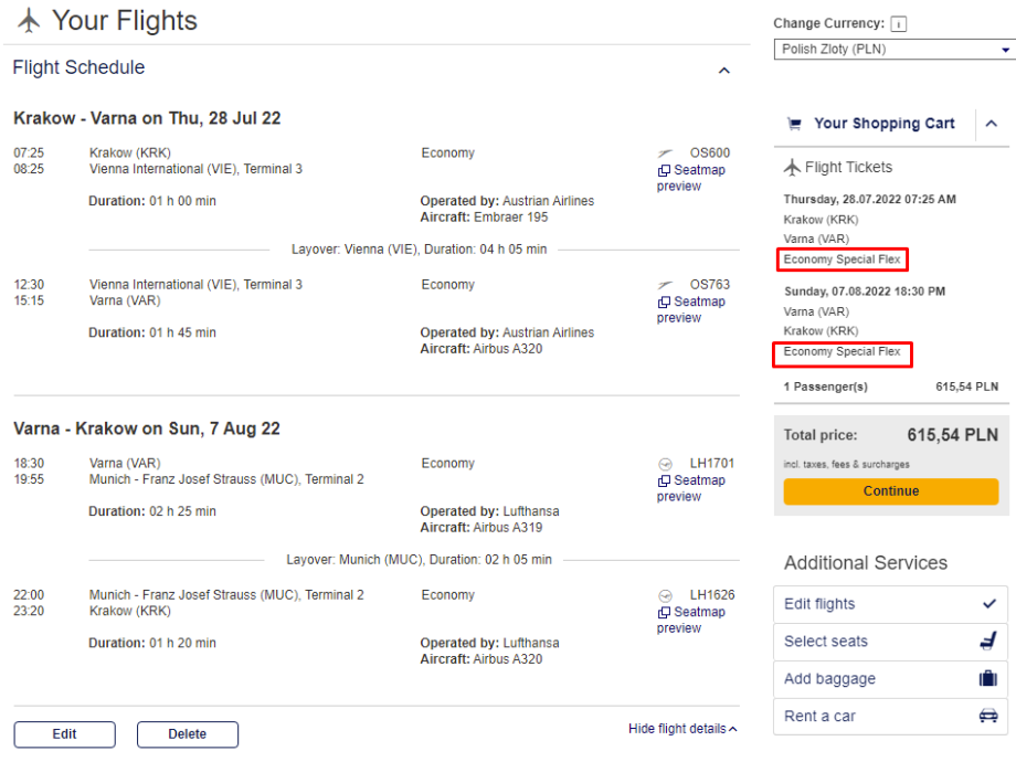 Aktuálně běží promo u LH Group, tzn. LH, LX, OS na Economy Flex tarif. Jedná se o tarify KEUFLXK8/KEUFLXS8, kdy RBD je K, pokud byste hledali na matrix.itasoftware.com. Benefity viz screen. Nejlevnější lety jsou z Polska. V podstatě platí na všechny destinace v EU, nějaké výjimky tam jsou. .