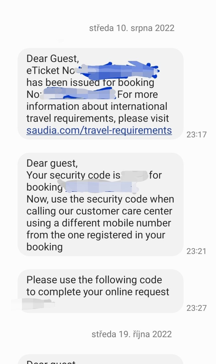 Ten jsem dostal automaticky při rezervaci na saudia.com. Ještě bych potřeboval získat kód od jiné rezervace přes SA, abych nemusel řešit změny přes ně. O rozhašené rezervaci mi nenapsali ani čárku; nebýt SMS od Saudie, tak nic nevím...